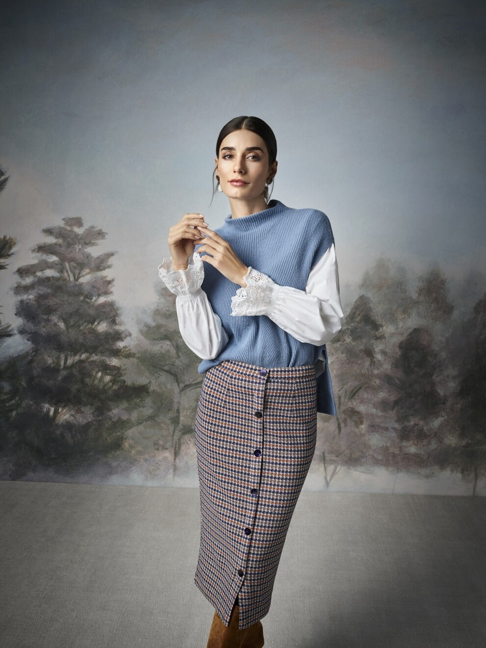 Юбка длины миди – еще один универсальный солдат осенне-зимнего сезона, с которым можно сложить эффектный образ. Причем одна и та же модель будет уместна как днем, так и вечером. Например, нежно-розовую плиссировку Patrizia Pepe можно соединить с грубыми ботинками и объемным свитером, а более строгой модели в клетку Rich&Royal легко добавить торжественных нот с помощью шелкового топа или нарядной блузы с бантом.