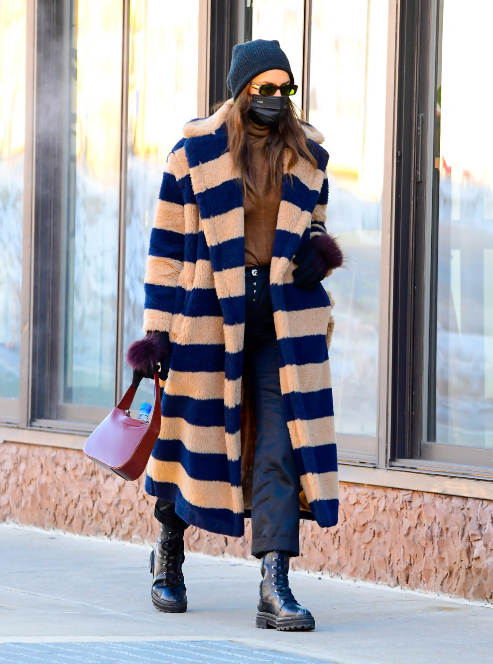 Не только в Киев, но и в Нью-Йорк пришла в феврале настоящая зима. В связи с нагрянувшими морозами трендсеттер и модница Ирина Шейк решила значительно утеплиться. Streetstyle-звезда появилась в районе Сохо в полосатой шубе из искусственного меха Max Mara. Объемную шубу в сине-бежевую полоску Ирина скомбинировала с водолазкой в карамельном оттенке, брюками с подворотами и грубыми ботинками на шнуровке. Завершила ансамбль Шейк синей шапкой-бини, перчатками с пушистыми помпонами, прямоугольными очками и бордовой сумкой формы «багет» By Far. В результате топ-модель продемонстрировала комфортный и стильный зимний образ.