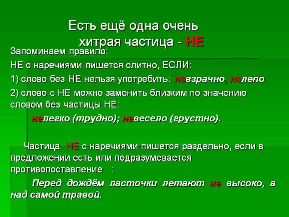 Чтобы понять, как употреблять частицу — не, вначале следует изучить правила грамматики. Не с прилагательными, наречиями употребляется раздельно, если: