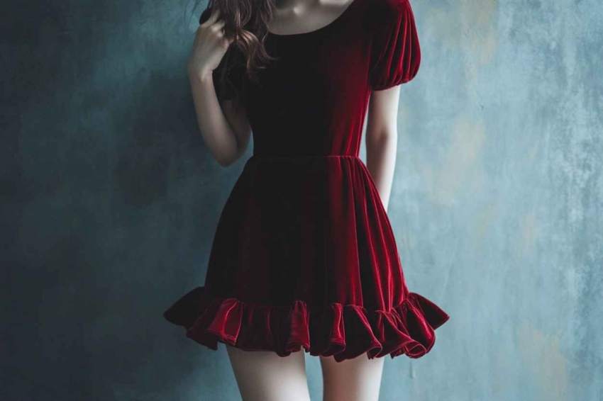 - Расклешенное бархатное платье с воланом, пришитым по подолу. При желании приобрести модель с корректирующим фигуру эффектом стоит обратить внимание на дополнение запахом. Такой элемент придаст визуальной стройности.