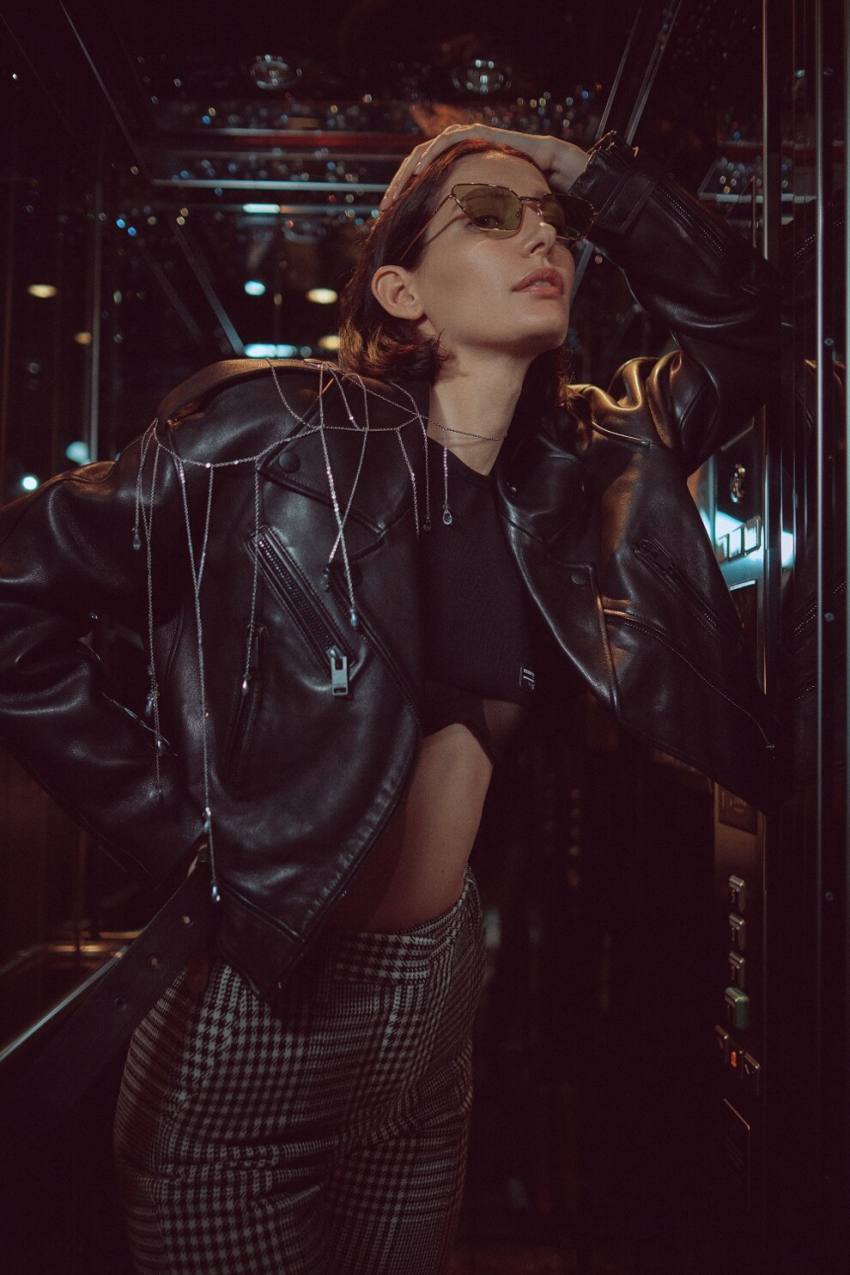 Жакет Jacob Lee, бра и лосины GucciВ этой съемке ставка сделана на одновременно практичные и эффектные вещи, которые с одной стороны абсолютно самодостаточны, а с другой, легко сочетаются друг с другом. Так, в этом году нам не обойтись без белоснежной двойки, под которой всегда можно спрятать блестящий топ, платья в бельевом стиле в карамельном оттенке, костюма из эко-кожи на каждый день, пальто в клетку и, естественно, косухи. Правда, стилист проекта выбирает ее укороченную версию, а вот сочетать предлагает ее с обтягивающими топами и нижним бельем.
