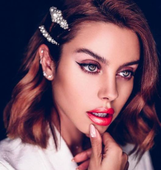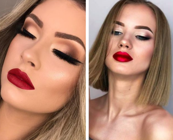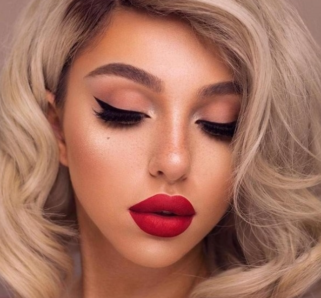 - Бежевые нюдовые тени и красные стрелки. При желании можно накрасить ресницы в стиле 60-х (обильно, не убирая комочки и немного склеивая ресницы). Такой вариант подойдет молодым девушкам и смелым дамам. В данном макияже сочетаются тренды 2020 и 2021 годов.
