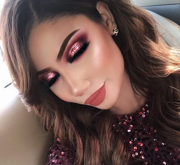 - Чтобы лучше передать настроение Нового года, можно воспользоваться глиттерами. Они помогут быстро сделать образ ярким и нежным. Для макияжа с использованием крупных блесток нужно сначала положить на него основной оттенок (можно взять кирпичный). Уже сверху на него наложить сияющий глиттер. Можно также добавить пышные накладные ресницы.