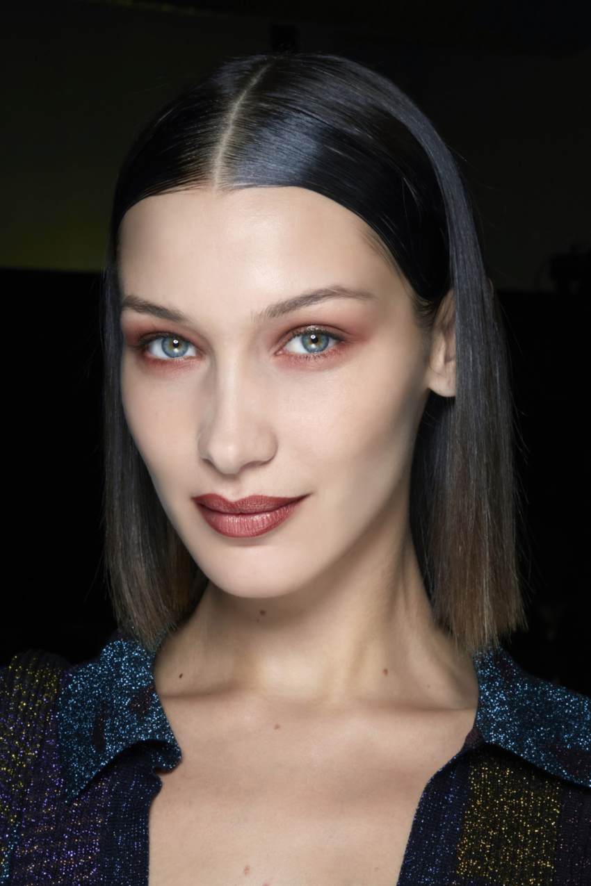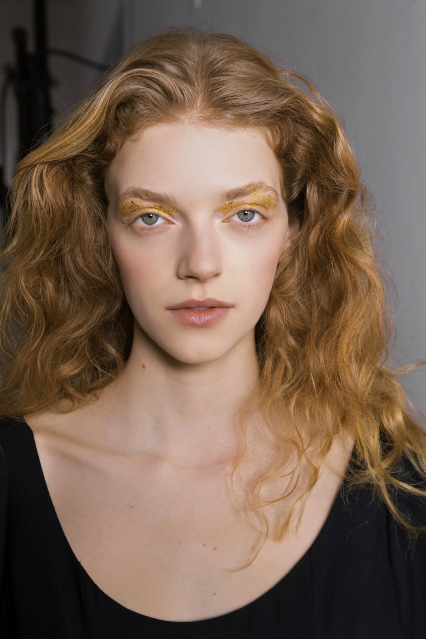 PradaВспышка на солнцеВ качестве яркого акцента в макияже можно выбрать яркие тени (самые яркие, которые есть в косметичке). А усилить торжественность момента можно с помощью глиттера в тон, как на показе Gabriela Hearst.