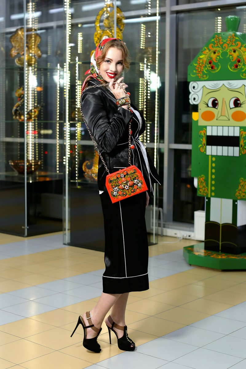 Сочетание нескольких принтов в этническом стиле подвластно только настоящим профессиональным. В этом образе обладательницы титула «Миссис Россия 2017» Полины Дибровой прекрасно сочетаются сразу два активных принта – оранжевые бутоны на платье перекликаются с красными маками на аксессуарах – сумке и ожерелье из коллекции бренда «Модная сказка хохломы». Такой образ произведет фурор на любом светском мероприятии.