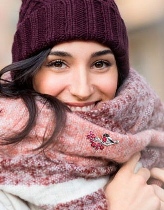 Очень привлекательно выглядит нежная аккуратная брошь на объемных шарфах, воротниках, шапках и шляпках. С ее помощью можно закрепить концы палантина, чтобы они не сваливались с плеч. Но украшая эти аксессуары, помните, что отныне ваше лицо будет под пристальным вниманием окружающих.