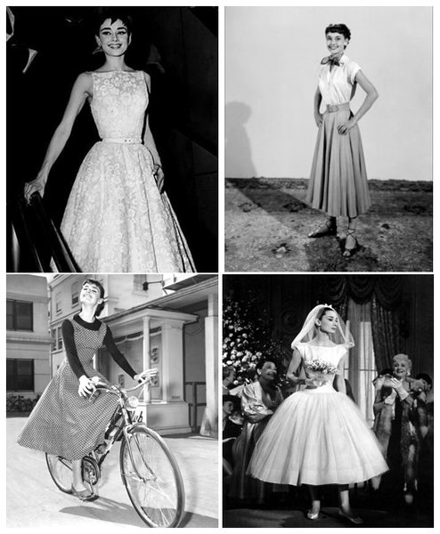 Еще один любимый силуэт Одри Хепберн – А-образный. Платья, сарафаны или комплекты с пышным юбками в стиле New Look, изобретенном Кристианом Диором и с блеском воплощенным в данном случае Юбером Живанши, одинаково хорошо подчеркивали осиную талию актрисы (51 сантиметр при росте 170 см!) и ее изящные руки. Неудивительно, что именно в таком романтичном образе кинодива предстала на премии «Оскар» в 1954 году, где и получила заветную статуэтку за роль в фильме «Римские каникулы» (там она сыграла сбежавшую принцессу, которой захотелось развеяться в прекрасной столице Италии). Милое платье с ажурной вышивкой получило название «Цветочное платье Одри».