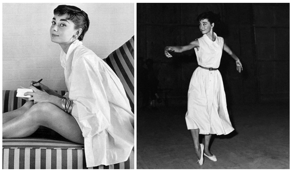 Восхитительно, естественно и современно Одри Хепберн выглядела в рубашках, а особенно – в платьях-рубашках. В 50-е, как и в наши дни, эти изделия были в моде. Поклонников восхищала утонченность вкуса кинозвезды: абсолютное отсутствие каких-либо изысков ни в цветах, ни в фактурах, ни в силуэтах. Легкая небрежность и простота ее нарядов, между тем, смотрится очень женственно и грациозно. Актриса также выбирала рубашки без рукавов, а если с ними, то присбаривала эту деталь либо подворачивала.