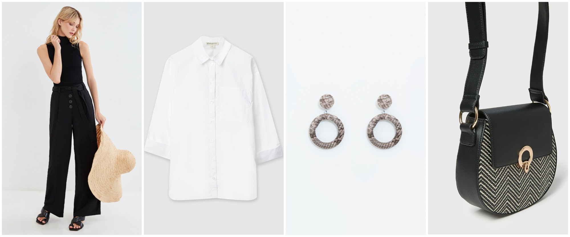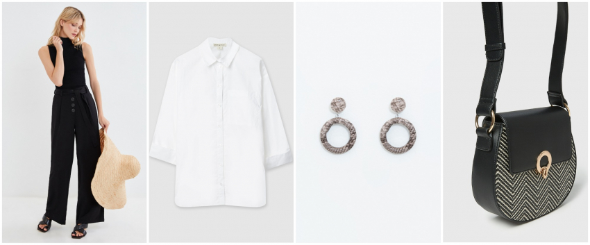 Если каждый look – это способ рассказать свою историю, то комплект с широкими брюками и базовой рубашкой повествует о поисках свободы и истинного предназначения. Для создания такого эффекта используйте традиционную цветовую связку из черных и белых элементов. Слишком формально? Не стоит недооценивать силу деталей — возьмите жесткую сумку с графическим принтом и актуальные серьги.