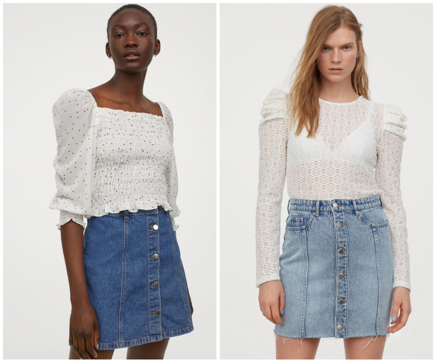 Стиль 80-х — это не только буйство цвета и доминанта синтезатора в музыке, но и объемные рукава на блузах. Кстати, они снова на пике популярности. Не нужно бояться, что плечи будут казаться бесконечными — просто подбирайте верх с правильным геометрическим вырезом, который визуально «вытянет» туловище. Джинсовая юбка «заземлит» воздушность комплекта и создаст позитивное настроение.