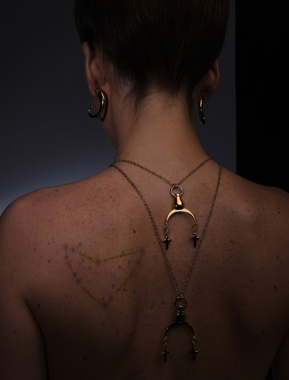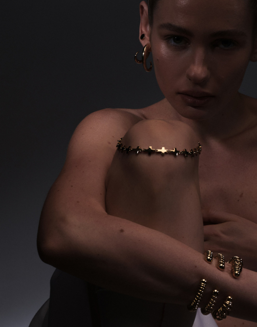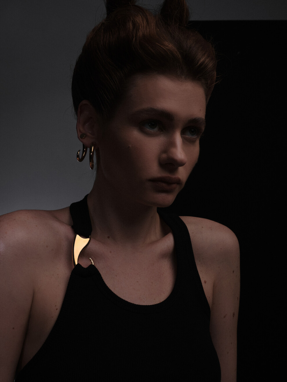 В новой серии TERRA, посвященной возврату к истокам, представлены подвеска в виде перевернутой бычьей головы, чокер, сложенный из тотемных крестов, и уже полюбившиеся публике спиралевидные браслеты из латуни с позолотой. Разработку одежды Солтес поставила на паузу, адаптировав для коллекции главный бестселлер LUTIKI асимметричную майку из хлопка — теперь ее украшает металлический крюк в форме бычьего рога.