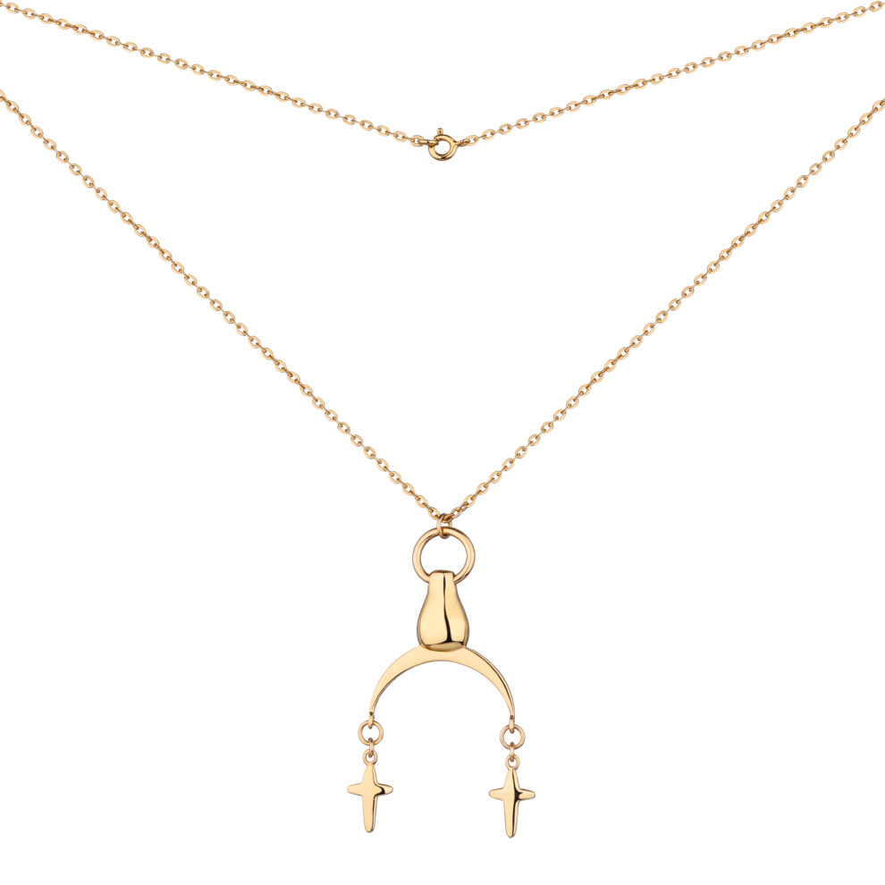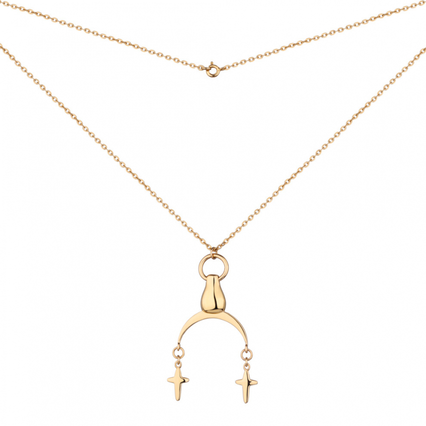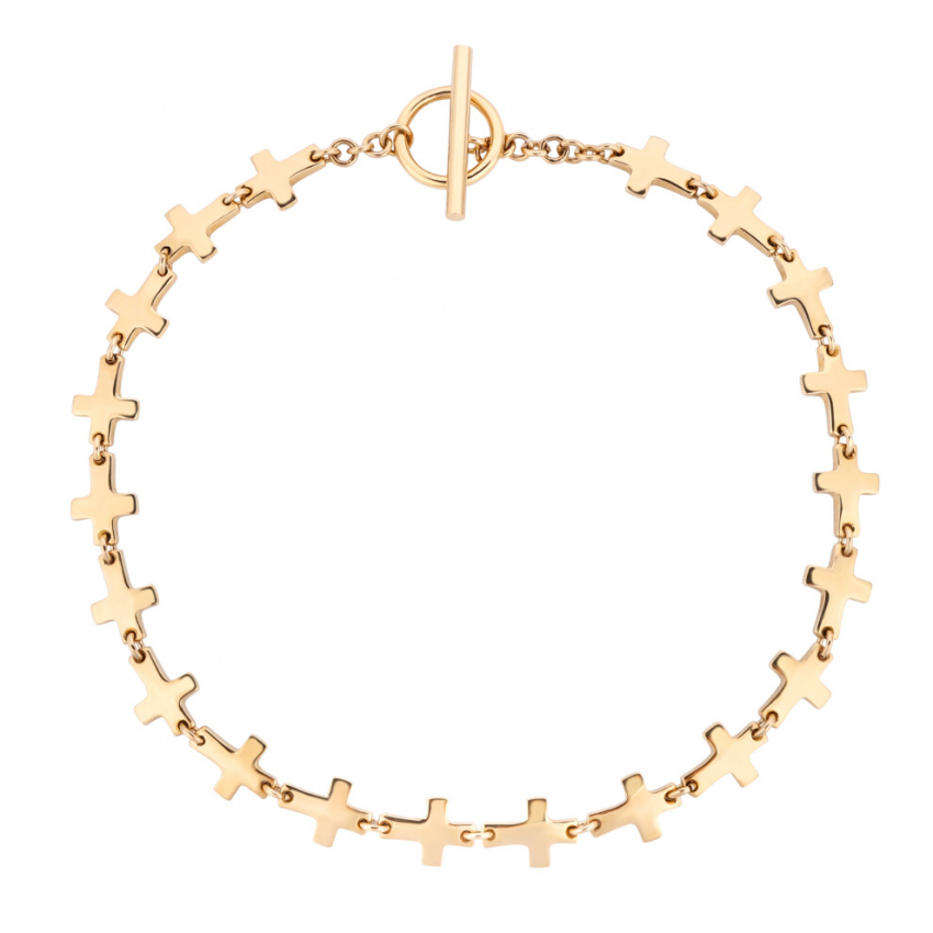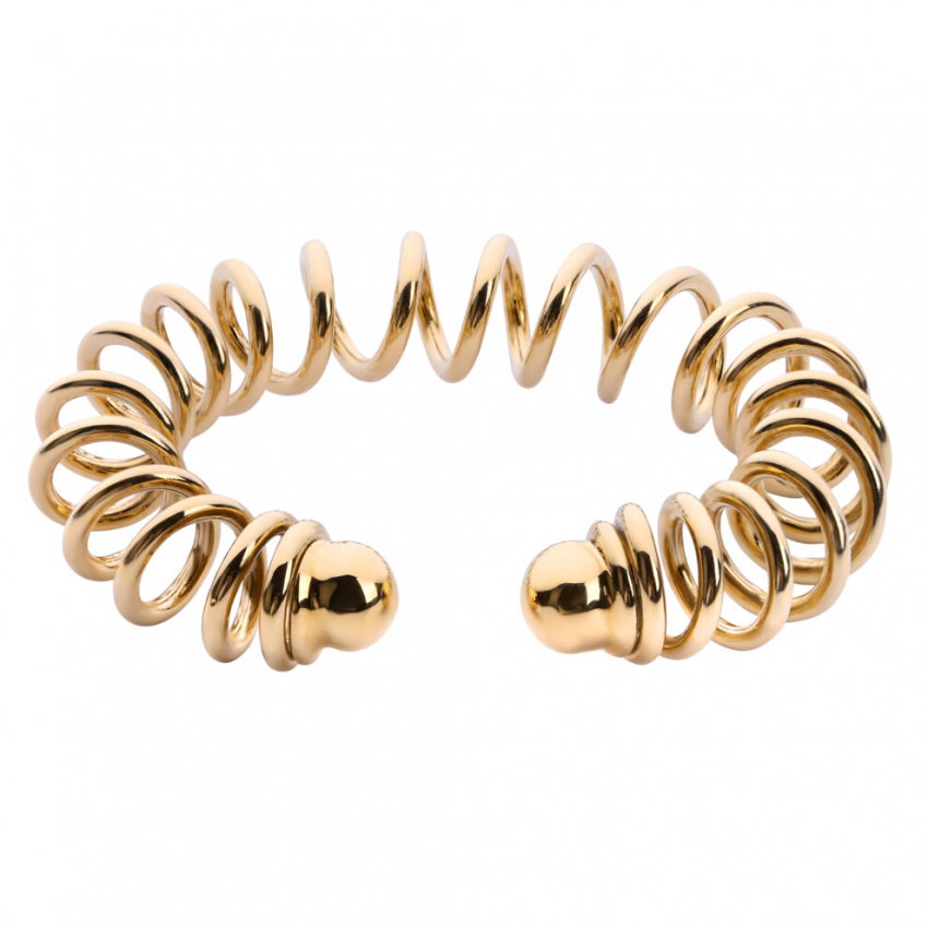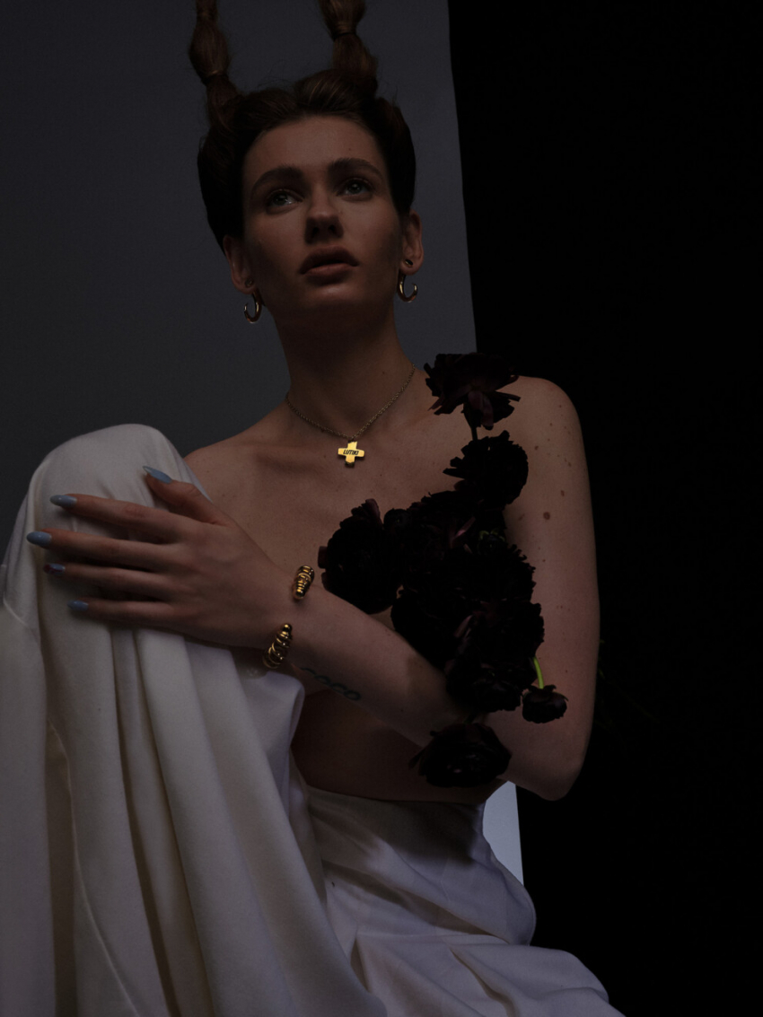 В новой серии TERRA, посвященной возврату к истокам, представлены подвеска в виде перевернутой бычьей головы, чокер, сложенный из тотемных крестов, и уже полюбившиеся публике спиралевидные браслеты из латуни с позолотой. Разработку одежды Солтес поставила на паузу, адаптировав для коллекции главный бестселлер LUTIKI асимметричную майку из хлопка — теперь ее украшает металлический крюк в форме бычьего рога.