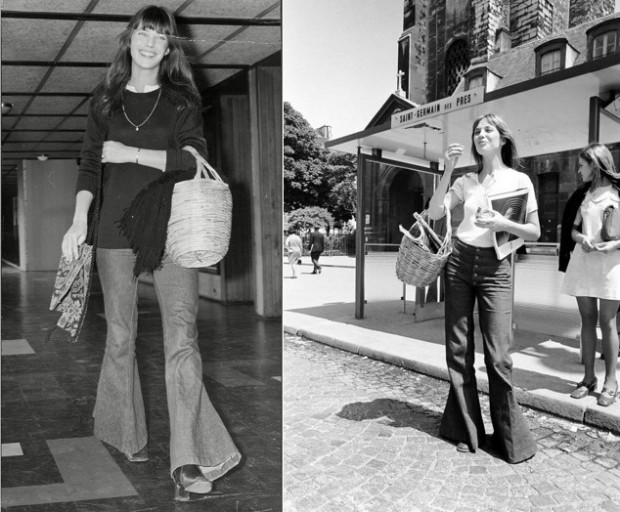Брюки-клеш - одна из главных примет моды 70-х и гардероба Джейн Биркин в том числе, ведь подобный крой еще больше подчеркивал стройные ноги актрисы. Лучшей парой к брюкам-клеш она считала обычные белые футболки и классические трикотажные водолазки, но всегда придавала образу пикантности с помощью отсутствия белья.