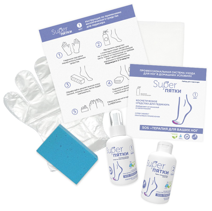 Рецептура этого набора разработана и одобрена подологами Израиля. Состав обогащен экстрактом алое вера, который обладает заживляющим и увлажняющим эффектом. В наборе есть все для проведения ритуала красоты: размягчающее средство-шаг 1 с удобным спреем-дозатором, крем-концентрат шаг 2, одноразовое полотенце, перчатки, косметическая пемза, инструкция.