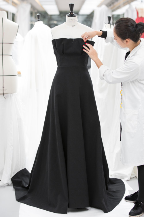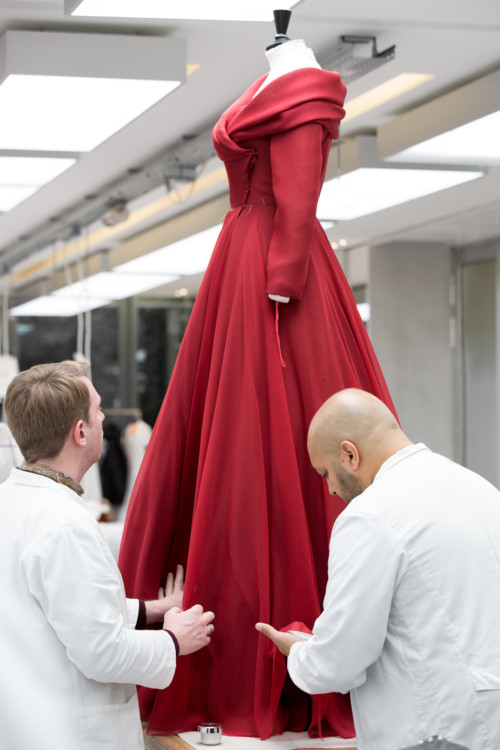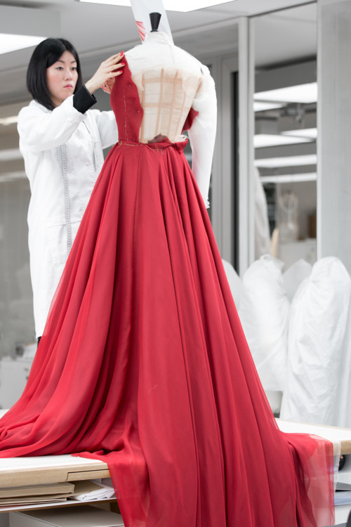 Платье Хелен Миррен стало одним из самых трудоемких для мастеров Christian Dior, которым понадобилось целых 600 часов ручной работы. Вдохновением для его создания стали архивы мсье Диора, а его секрет кроется в сочетании четрых слоев шифона разных оттенков красного, благодаря чему при движении создается муаровый эффект.