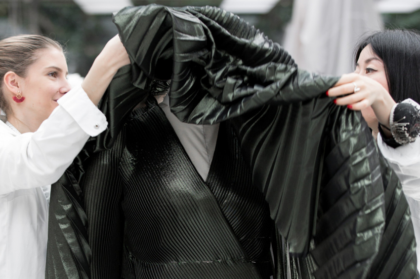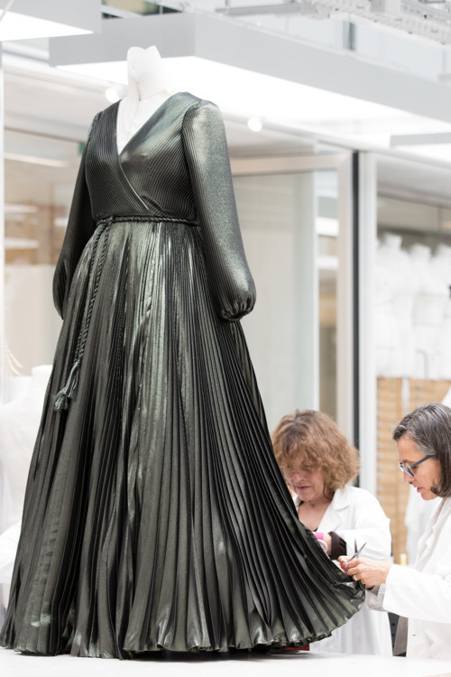 Платье актрисы Мэрил Стрип привлекало внимание деликатным сиянием, которого удалось достичь благодаря ткани ламе. На его создание ушло 350 часов ручной работы, а при ближайшем рассмотрении можно увидеть вышитые темно-зеленые и черные нити.