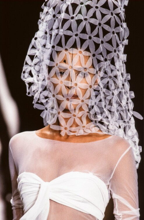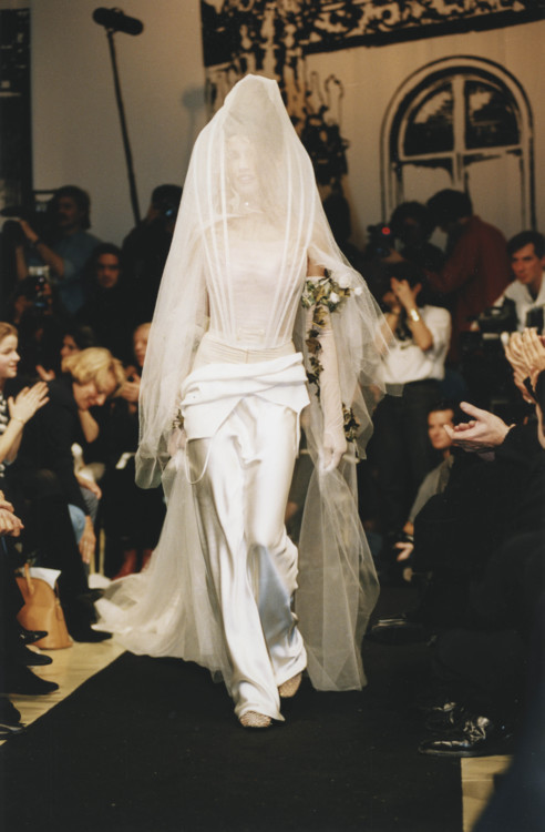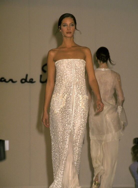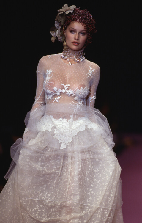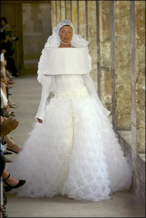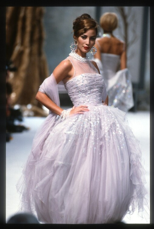 Chanel Haute Couture осень-зима 1995/1996 Кристи ТарлингтонСупермодель 1990-х Кристи Тарлингтон была одной из девушек легендарного союза Trinity, куда также входили Линда Евангелиста и Наоми Кэмпбелл. Кристи была идеалом красоты и эталоном элегантности для будущих невест. Она не единожды вдохновляла дизайнеров на создание свадебных образов и закрывала показы кутюрных коллекций. Так, в 1991 она появилась на подиуме Chanel в пышном свадебном платье-бюстье из полупрозрачного тюля и сетки, а в 1993 году закрыла показ Ralph Lauren в силуэтном мерцающем платье, украшенном нитями жемчуга.