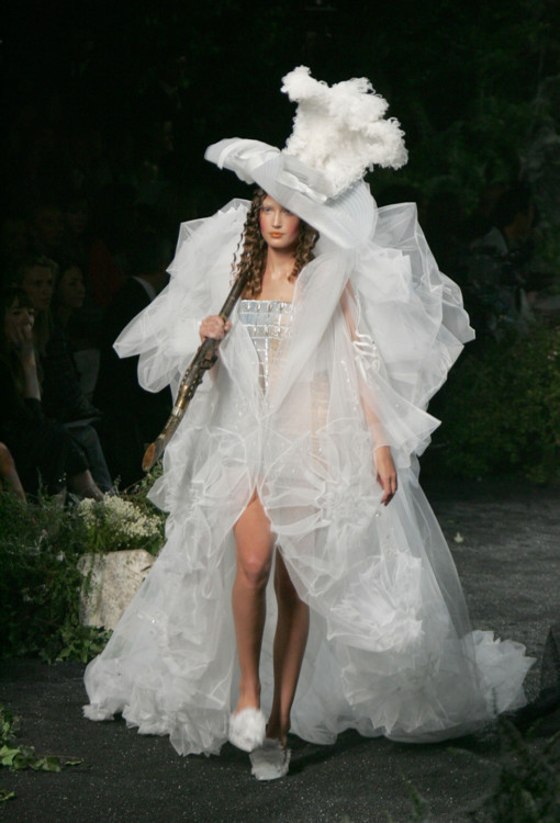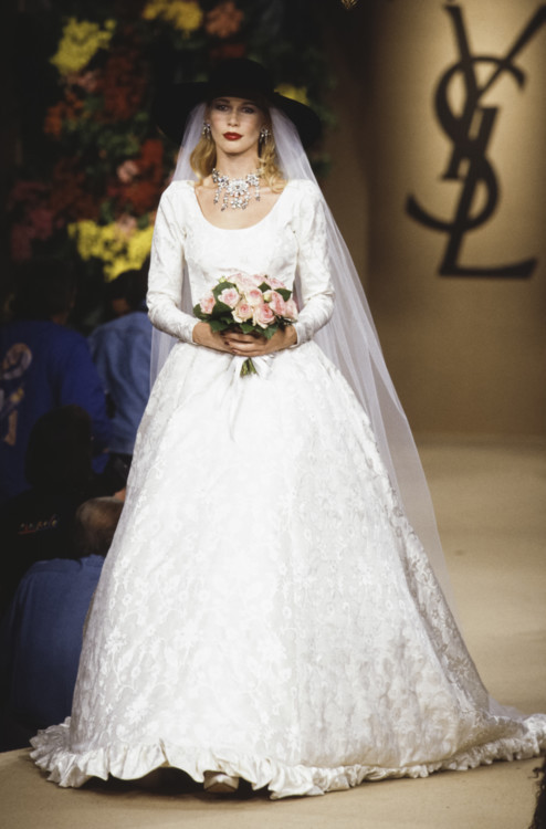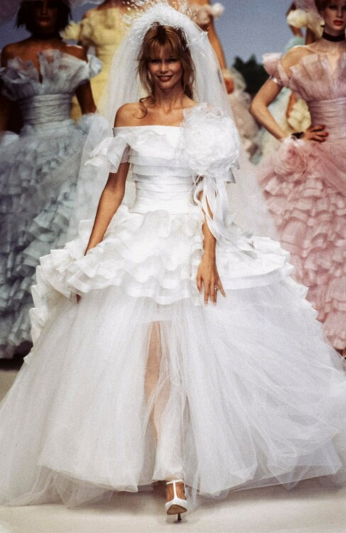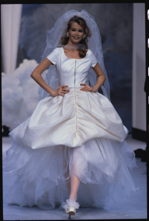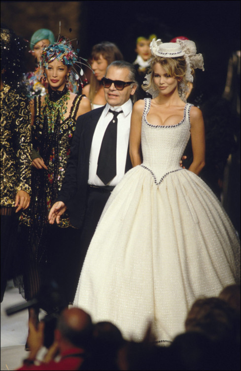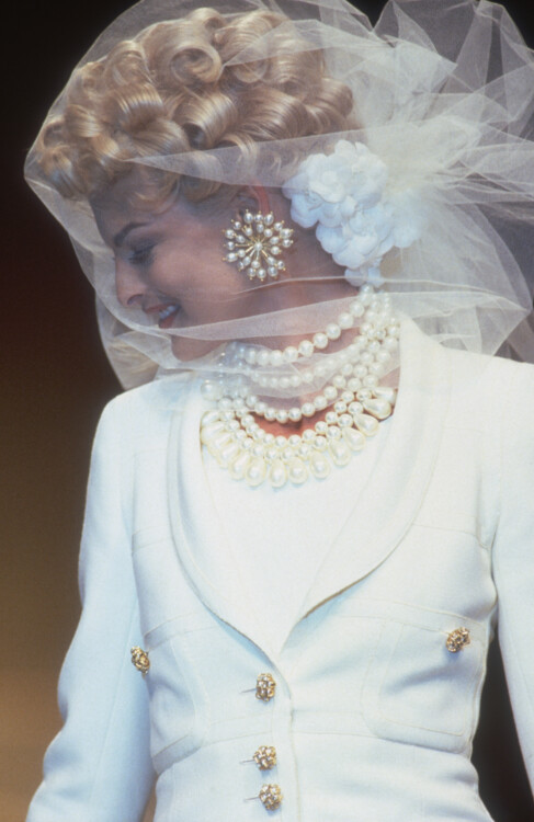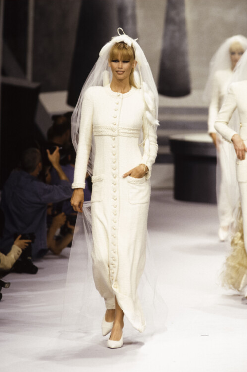 Клаудия Шиффер была любимой моделью и музой Карла Лагерфельда в 1990-х. Легендарный кутюрье заметил Шиффер еще в начале ее модельной карьеры и с тех пор их союз продлился 7 лет, а дружба до конца жизни дизайнера. Клаудия всегда закрывала показы Chanel в потрясающих свадебных платьях. Так, в 1991 девушка дефилировала в полупрозрачном белом платье с пышными рукавами, обрамленное изящными нитями жемчуга, в 1993 году надела свадебное платье из макраме, а в 1995 примеряла пышный наряд из твида.