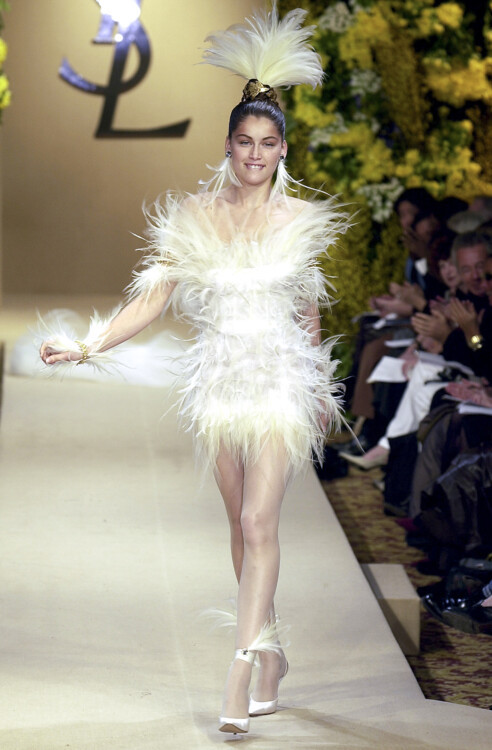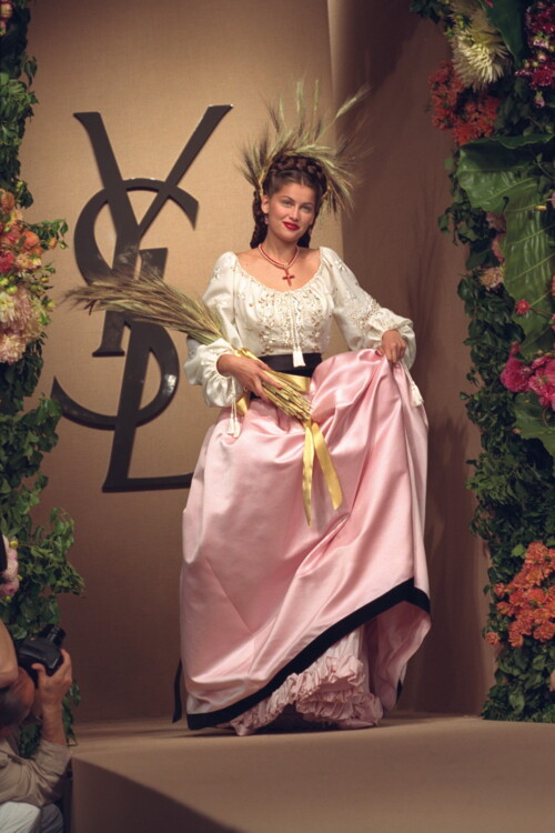 Дизайнер Ив Сен-Лоран известен большим количеством красивых женщин, окружающих его в разные периоды жизни. Так, Катрин Денев, Верушка, Лулу де ла Фалез, Бетти Катру, Палома Пикассо и Летиция Каста были главными женщинами в жизни дизайнера, вдохновляющими его на создание роскошных платьев. Летиция Каста присоединились к этому списку в конце 1990-х годов и навсегда запомнилась эффектными свадебными платьями, закрывающими шоу Yves Saint Laurent. В 1998 году модель появилась в нежном кружевном платье А-силуэта, которое сразу стало объектом охоты всех модниц, в 2000-м закрыла показ в свадебном образ, выполненном на русский манер, а в 1999-м появилась на подиуме словно нимфа в «голом» цветочном платье.