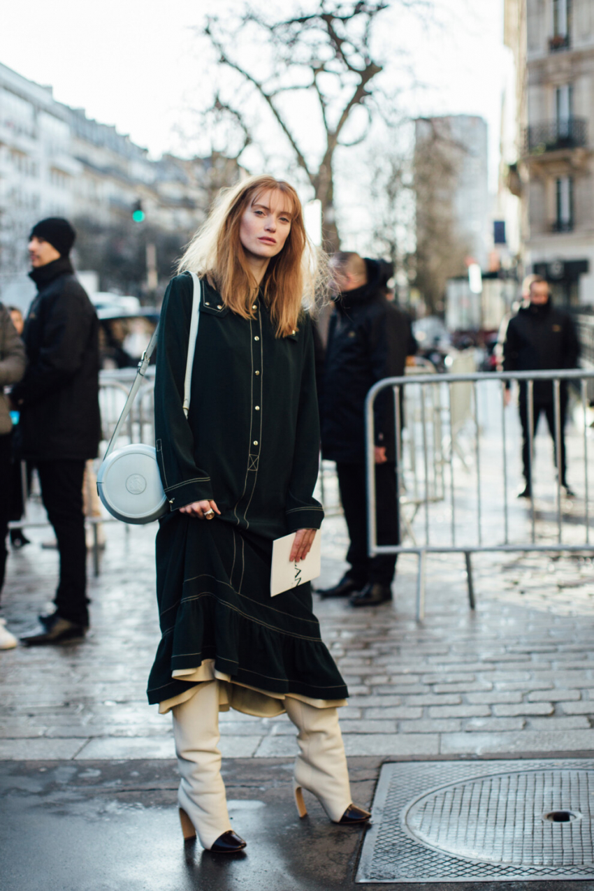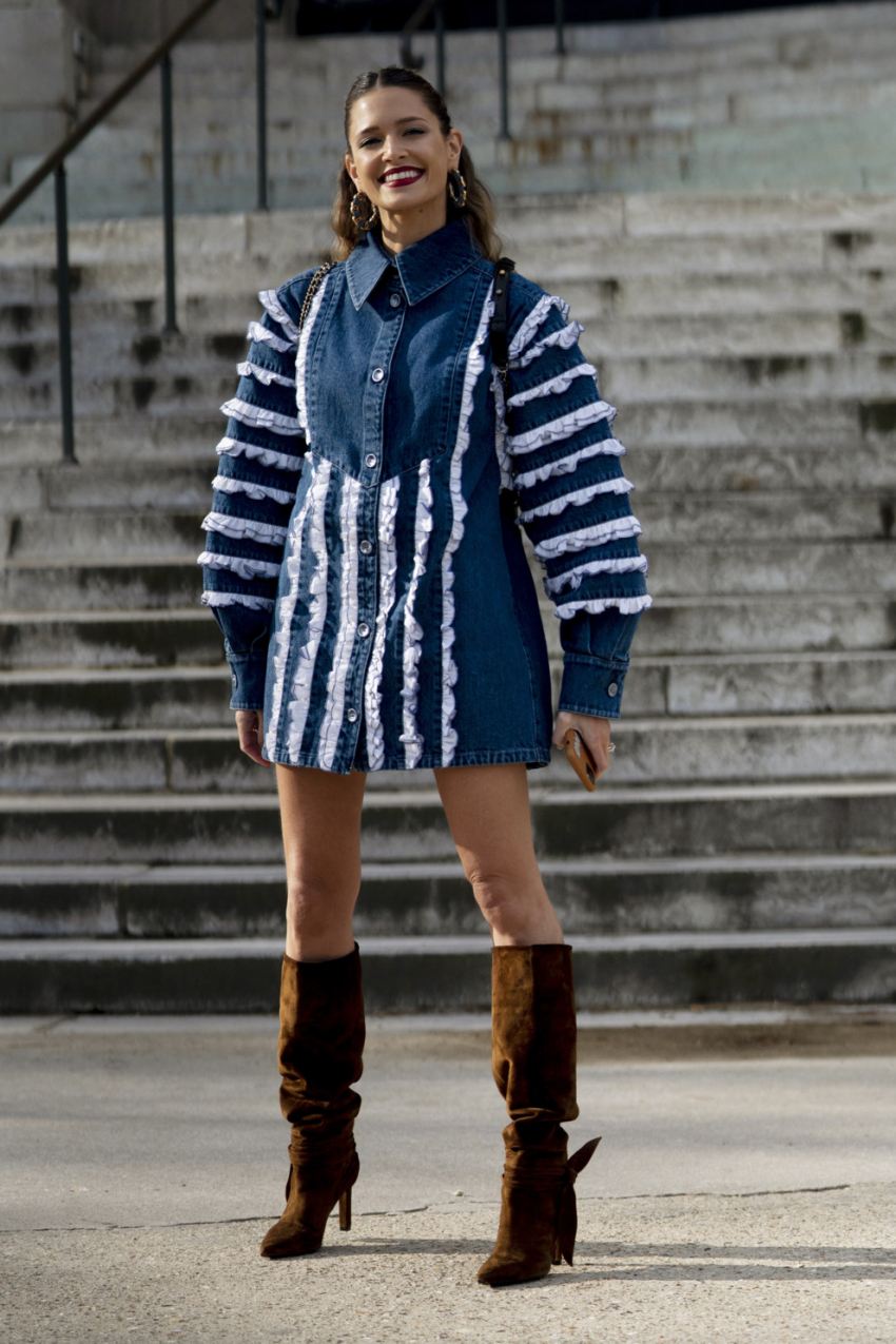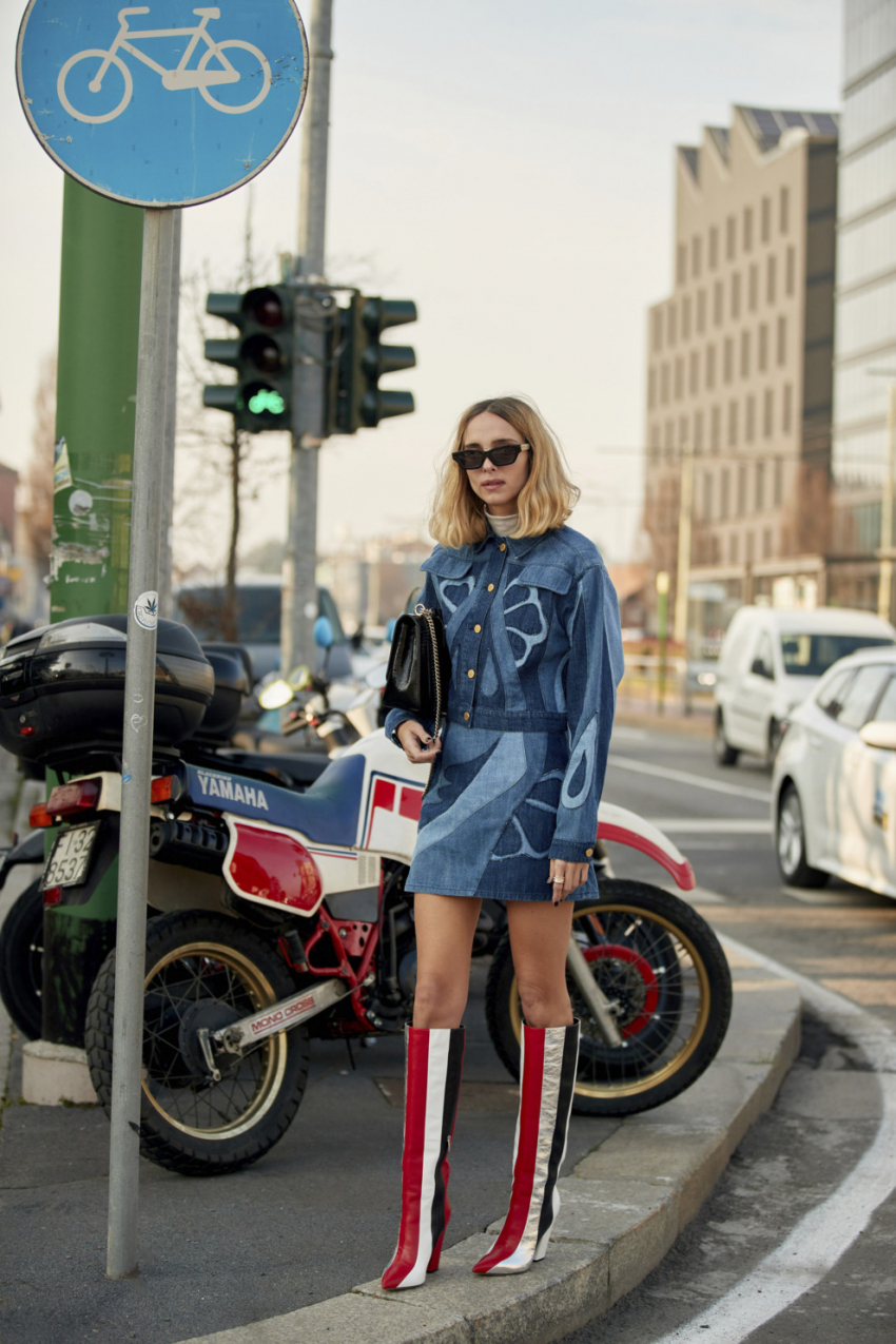 Isabel Marant, Pre-Fall 2020Особой любовью модницы прониклись к мини-платьям из денима. В тандем к ним it-girls выбирали высокие сапоги и массивные, но лаконичные украшения – серьги-кольца или кольца-печатки. Эффектно и необычно смотрятся джинсовые платья-пальто длины миди –вещь, способная хорошо выполнять обе функции. Их модницы дополняли актуальными kitten heels и геометрическими сумками. Если хочется совместить два тренда, звезды streetstyle-хроник советуют обратить внимание на сочетание платья из денима и анималистичных принтов: особенно в таком комбо хорошо смотрится принт, имитирующий окрас зебры, например, на высоких драпированных сапогах.