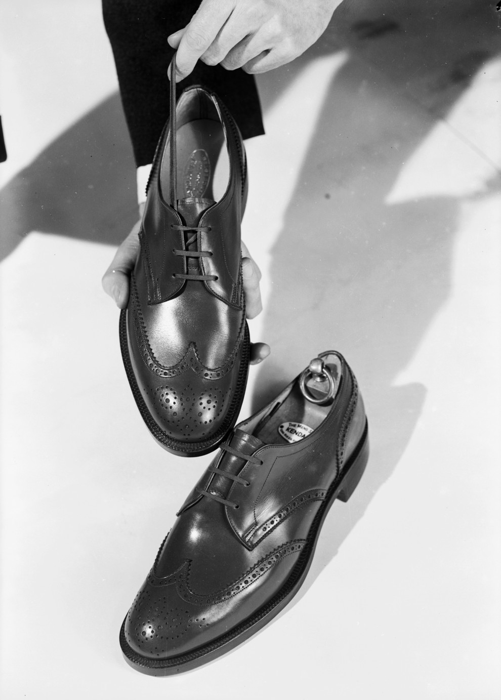 Броги, 1953Изначально броги были разработаны в Шотландии и Ирландии как пара для работы на открытом воздухе. Сельская местность этих регионов характеризуется высокой влажностью и болотистыми землями. Локальным фермерам нужна была обувь, подходящая для тяжелых работ на бездорожье. Изначально броги представляли собой примитивную пару, сделанную из не дубленой кожи, а их отличительной особенностью была серия перфораций и зубцов на каждом куске кожи, использовавшейся при их изготовлении. Эти перфорации позволяли воде стекать с обуви. Ранние модели, которые назывались гилли-броги, представляли собой модель без язычка с высокими шнурками, обвивавшими щиколотку, которые плотно удерживали обувь и не позволяли ей слетать с ноги при ходьбе по густой грязи.