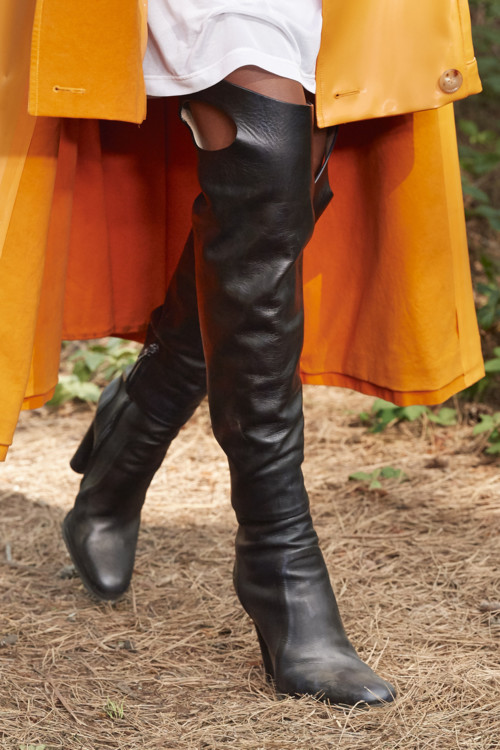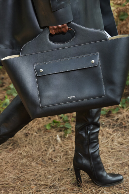 Несмотря на то, что показ коллекции Burberry весна-лето 2021 состоялся без зрителей в лесу недалеко от Лондона, креативному директору бренда Риккардо Тиши удалось провести физическое шоу и окунуть всех в свое меланхолично-отшельническое настроение. Главным лейтмотивом коллекции стало море, которое улавливается и в аксессуарах – одной их визитных карточек Burberry. К классическим кожаным сумкам-полумесяцам дизайнер добавил шоперы, сплетеные на манер рыбацких сетей, а ботфорты напоминали о высоких сапогах моряков.