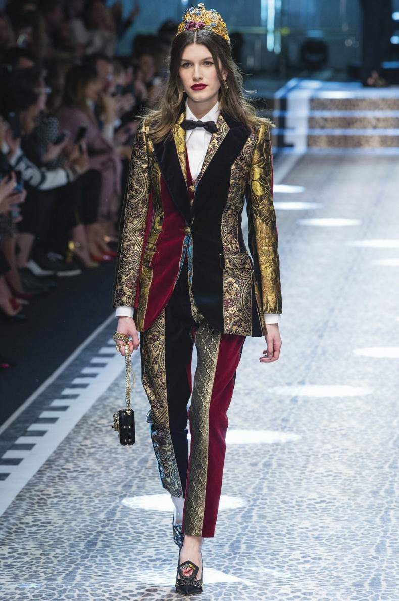 Брючный костюм оказался долгоиграющим трендом, дизайнеры который сезон предлагают его женщинам в качестве офисной униформы. Но традиционные синие и серые варианты на празднике будут смотреться слишком буднично, поэтому обратите внимание на цветные костюмы. А для самых отважных — пэчворк и психоделические узоры.