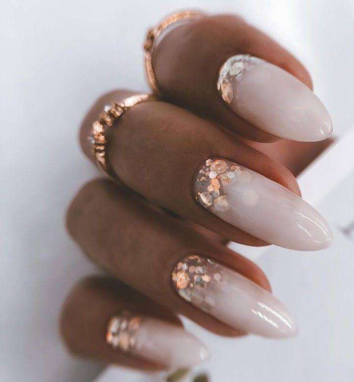 Один из самых нежных, изящных и стильных вариантов свадебного маникюра — светлые ногти с блестящими частичками под основным цветом. Такие блестки слегка проглядывают и мерцают, становясь элегантным акцентом для образа невесты.
