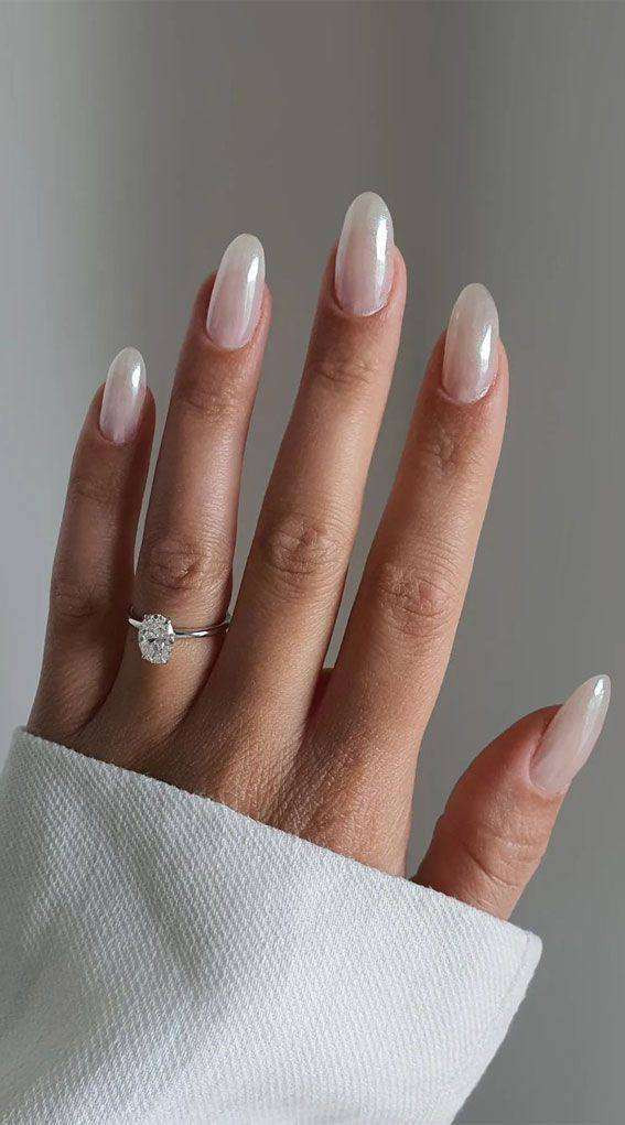 Жемчужная втирка не теряет популярности у невест, она блестит и переливается, выглядит нежно, женственно и очень привлекательно. Втирка — это идеальный компромисс между праздничным маникюром и нежностью, которую требуется поддерживать в свадебном образе.