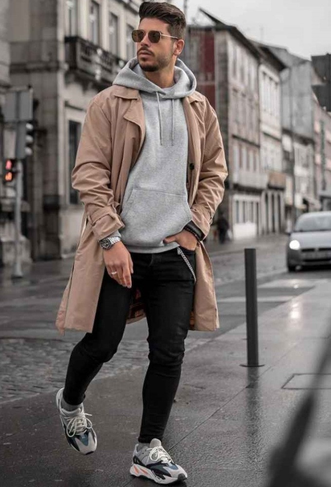 - Контраст стилей: спортивная обувь сегодня спокойно сочетается с повседневными брюками, а чтобы комплект был цельным, его дополняют худи. Характерный пример есть у Givenchy: стильное пальто с атласными лацканами, брюками со стрелками — и полуспортивные ботинки.