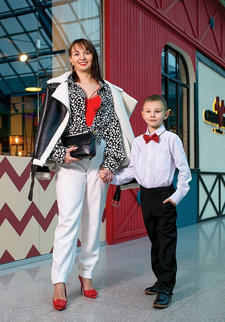 Составляя вечерние образы, мы намеренно выбирали универсальные вещи, которые легко можно адаптировать к повседневной жизни — весьма практичное решение. Праздничное настроение создают яркие акценты, выдержанные в единой красной гамме: туфли на шпильках и топ у мамы, галстук-бабочка у сына.