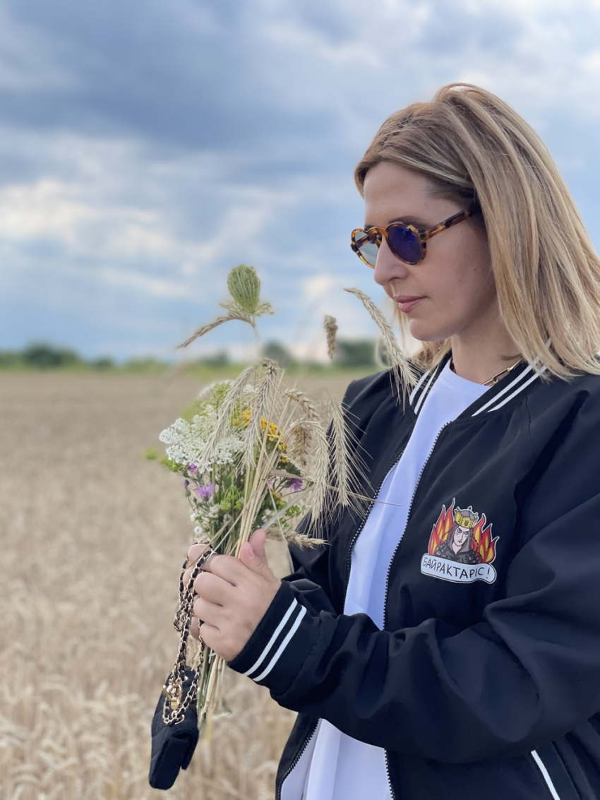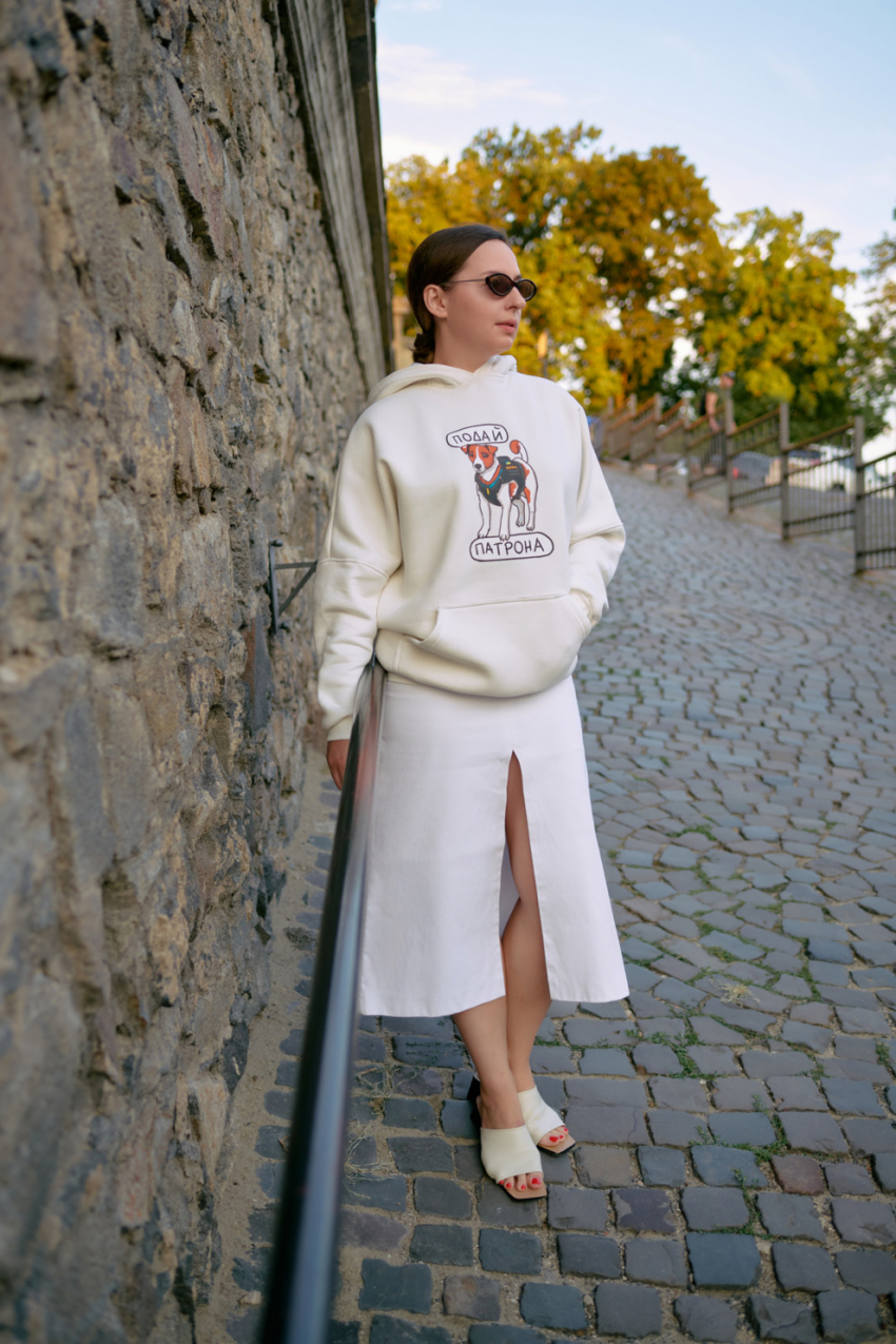 Патріотичний мерч – це одяг, який хочеться носити. Він дає змогу без слів висловити підтримку «своїм», показати, що ми – однієї крові. Але дотепер я не мала жодного «патріотичного» предмета одягу – не знаходилося того, що збігалося б з внутрішнім відчуттям доречного. Проте зараз, здається, я зібрала класну капсулу: і для міста, і для заміських прогулянок. Все легко поєднується одне з одним – і легко мати вигляд updressed, але не overdressed. Моя улюблена річ з колекції – бомбер з Патроном. Я лайкаю всі фото собачки в інстаграмі, коментую їх і навіть робила інтерв’ю з її власником, тож вибір був визначений. До речі, цей бомбер двосторонній – можна носити як білим наверх, так і чорним, а це дуже зручно. Футболку обожнюю за рядки Сосюри, а наплічник – це класна альтернатива тривожній валізці. І в нього легко вміщується ноутбук.