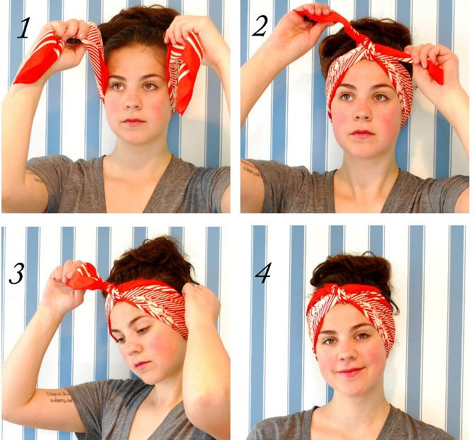 Бандану можно завязать как украшение для волос, способом наоборот. Делается это так: