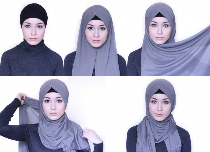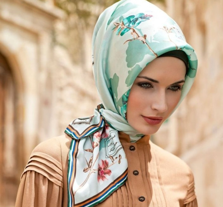 Можно красиво носить платок, как это делают девушки-мусульманки. Способ непростой. Для него требуется большой по размеру аксессуар, длиной 120-140 см, так как им нужно закрыть полностью волосы и шею. Схема завязывания: