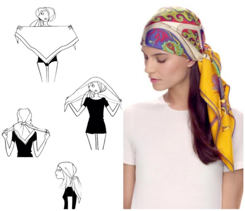 - Косынка кладется на голову по диагонали. Ее кончики должны оказаться сбоку.