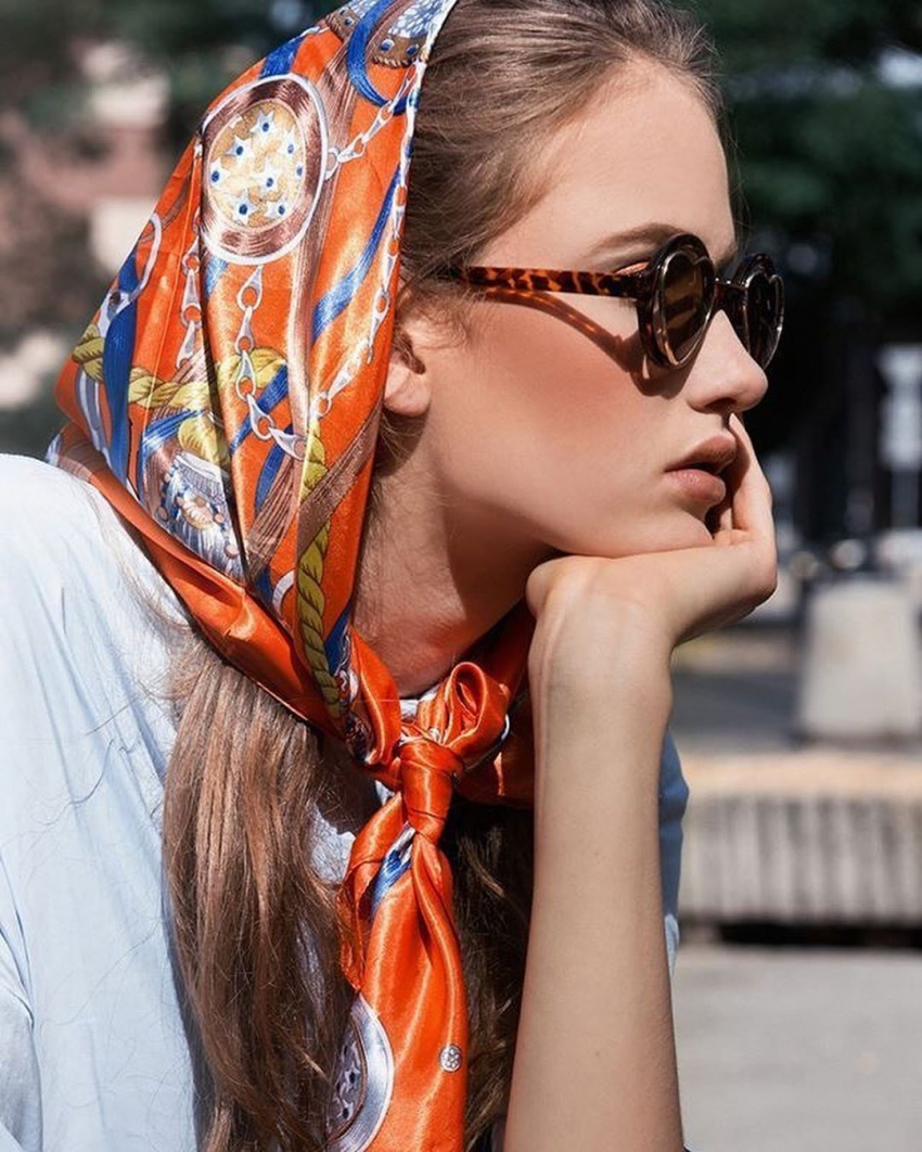 Кстати, принт и цвет вашей косынки тоже имеет значение. Выбирайте модные цвета 2021 года: классический синий, красный, оранжевый, белый. Принт – полоска, цветы или классический орнамент культового шелкового платка каре, как у бренда Hermes. Сегодня, к счастью, можно найти модели поскромнее.