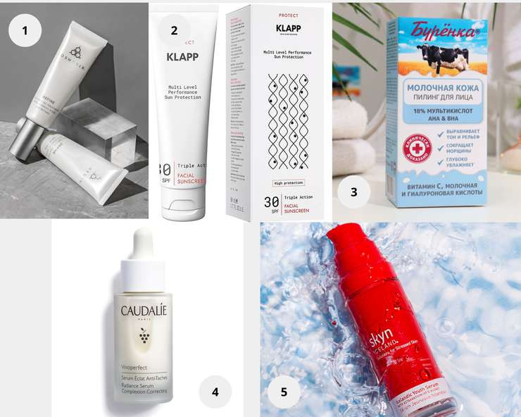 1. Сыворотка обновляющая антивозрастная с AHA и 0,25% ретинолом Define, COSMEDI× 2. Klapp Multi Level Performance Sun Protection Cream SPF30 Солнцезащитный крем. 3. Буренка Пилинг для лица мультикислотный 18% AHA&BHA. 4. Сыворотка для сияния Vinoperfect Caudalie. 5. Омолаживающая сыворотка для кожи под глазами Icelandic Youth Cooling Eye Roller Skyn Iceland.