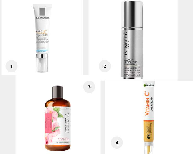 1. La Roche-Posay Крем против морщин, мешков и темных кругов под глазами Redermic Retinol. 2. EISENBERG Маска для глаз подтягивающая с микрочастицами золота Eye Masque Ultralift Or. 3. Тоник для лица Pravilnaya Kosmetika, для сухой и чувствительной кожи, антивозрастной, Гибискус & Эстрагон. 4. Пробуждающий крем для кожи вокруг глаз с Витамином С, Garnier.